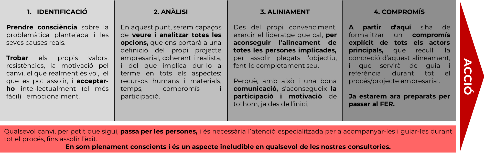 És evident que cal una anàlisi prèvia i una diagnosi acurades, per trobar i implantar solucions definitives. Però, sobretot, cal preparar la part més important: les persones que ho faran possible i el COM HO VIUEN; preparació indispensable abans d’iniciar qualsevol procés de canvi i/o transformació.